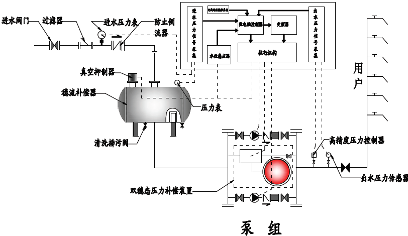 另外如設(shè)備原理圖所示,通過微機(jī)控制、雙穩(wěn)態(tài)壓力補(bǔ)償裝置及真空補(bǔ)償系統(tǒng),使本設(shè)備可以和自來水直接串接,因水泵工作的疊加原理,使設(shè)備可以充分利用自來水原有的壓力,增加了變頻調(diào)速給水設(shè)備的節(jié)能點(diǎn)。當(dāng)自來水壓力不足致使壓力下降時(shí),本設(shè)備通過真空抑制器及穩(wěn)流補(bǔ)償器中的檢測裝置采集穩(wěn)流補(bǔ)償器內(nèi)的水位信號,通過微機(jī)控制真空抑制器及雙穩(wěn)態(tài)壓力補(bǔ)償裝置中的的特殊裝置動作,抑制負(fù)壓的產(chǎn)生,保證設(shè)備不對城市管網(wǎng)產(chǎn)生任何影響。
