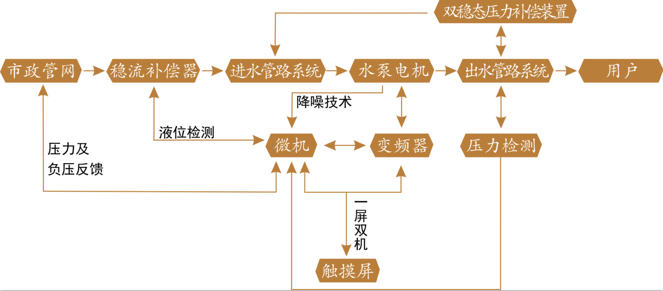 無負(fù)壓供水設(shè)備采用微機(jī)變頻技術(shù)、降噪技術(shù)、一屏雙機(jī)技術(shù)、雙穩(wěn)態(tài)壓力補(bǔ)償技術(shù)、負(fù)壓處理技術(shù)實(shí)現(xiàn)無負(fù)壓供水。通過觸摸屏顯示運(yùn)行狀態(tài),通過微機(jī)控制、雙穩(wěn)態(tài)壓補(bǔ)償裝置及真空補(bǔ)償系統(tǒng),實(shí)現(xiàn)了與自來水管網(wǎng)直接串接,并且克服了對管網(wǎng)的不良影響。